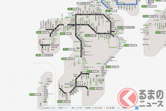 九州道は八代IC~えびのIC間が再開していますが、それ以外のほぼ全線がストップ。鳥栖JCTから東西に延びる長崎道と大分道、そして東九州道や西九州道・宮崎道・南九州道も多くの区間で通れない状況が続いています。
