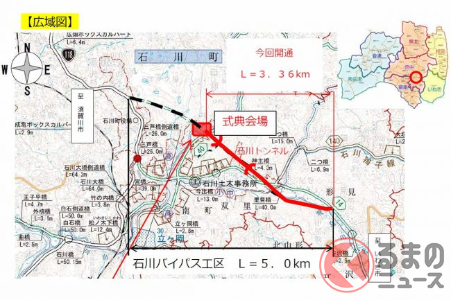 今回は、そのうち石川トンネル(584m)を含む東側区間3.36km(2工区)が開通します。現道と県道40号飯野三春石川線を短絡し、事業効果の早期発現を図るといいます。