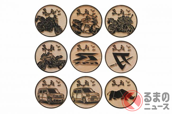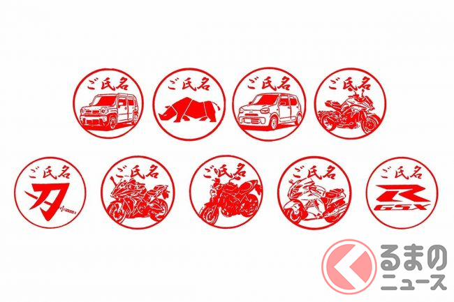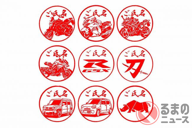 販売されている印鑑は9種類。クルマは「ハスラー」「アルト」、バイクは「カタナ」「GSX-S1000GT」「SV650」「隼」の車体イラストが描かれているほか、「カタナ」「GSX-R」のロゴや、「ジムニー」のマスコットであるサイも選べます。