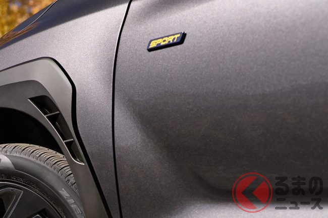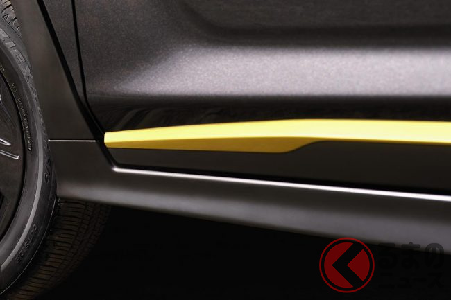 初公開に先立ちティザー画像を公開。フロントタイヤからボディサイドにかけての画像を見ると、ガンメタリックのボディに鮮やかなイエローのサイドガーニッシュや「SPORT」のバッジが装着されることがわかります。