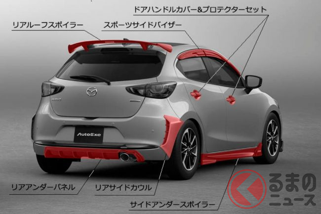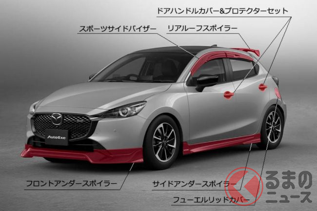オートエクゼは、2023年1月27日に大幅改良を受けたマツダ新型「MAZDA2(マツダ2)」用のスポーツパッケージともいえる「DJ-07」を先行公開しました。新型MAZDA2をよりスポーティな印象に進化させるチューニングパーツのようです。