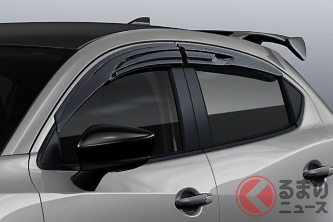 これら以外にも、走行時に発生する負圧を利用して車内の空気を積極的に排出するベンチレーション機構付き「スポーツサイドバイザー」、ドアハンドル部の塗装を保護しスタイリングにスポーティな装いを与えるマットカーボン調の「ドアハンドルカバー&プロテクターセット」を用意、MAZDA2の精悍なアスリート性に磨きを掛けたスポーツパッケージとなっています。