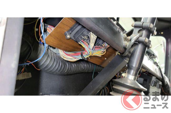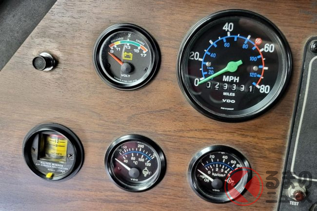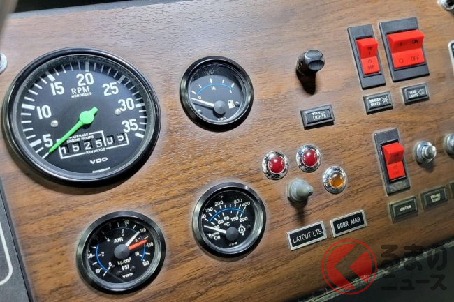 運転席には、木製のセンタークラスターを配置。計器やスイッチもそのまま残っています。