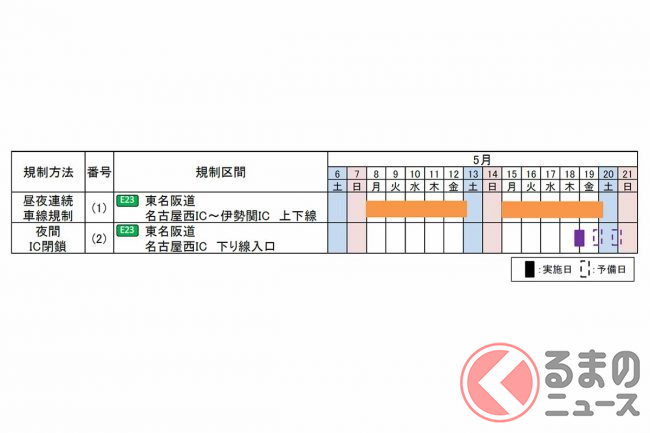 さらに5月8日2時から5月17日24時までの間、東名阪道に接続する名二環では、内回りの清洲JCT→名古屋西JCTで集中工事に伴う通行止めも計画されています。18日以降も車線規制が実施されます。