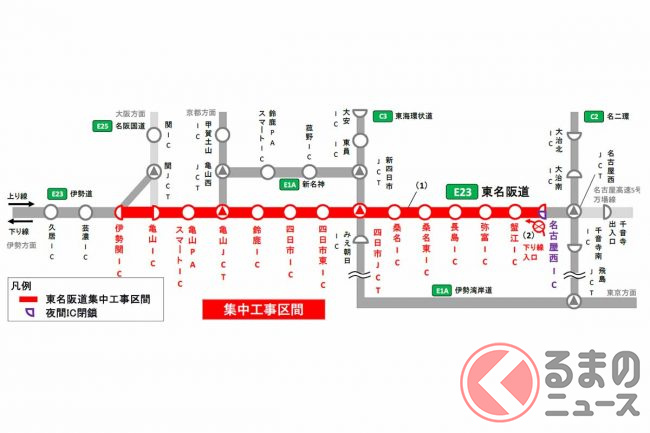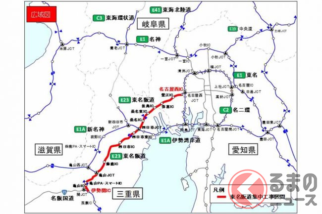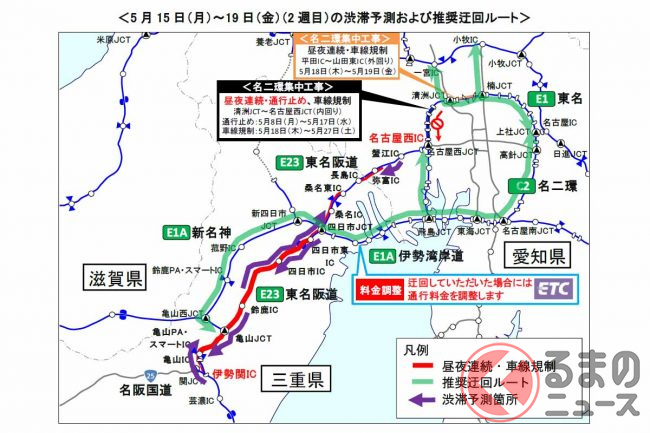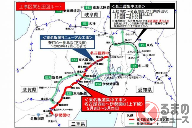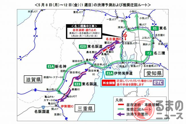 NEXCO中日本は、東名阪道の工事期間中は、新名神高速・伊勢湾岸道・名二環などへの迂回や、公共交通機関の利用を検討するよう呼び掛けています。