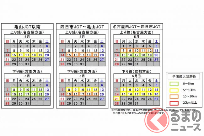 上りは桑名ICや名古屋西IC付近などで最大19km、下りは亀山PA付近や四日市IC付近でそれぞれ長くて10km前後となる見込みです。