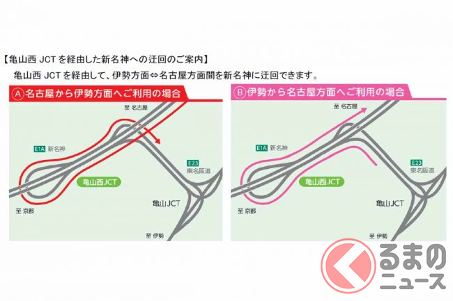 なお、名古屋~伊勢・名阪国道を移動する際の通行料金は、新名神と東名阪道のどちらを通っても同額です。亀山西JCTでは、名古屋方面~伊勢・名阪国道方面間の行き来が可能です。