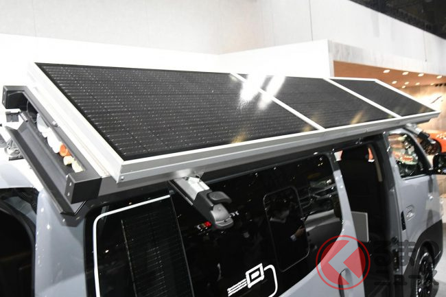 パワードベースフォープロ最大の特徴は、日産の電気自動車「リーフ」(初代)から取り出した再生バッテリーをポータブルバッテリーとして活用していることです。ルーフやリアガラスに設置された太陽光パネルで発電した電力をポータブルバッテリーに充電し、車内の電力を賄うというのだから驚きです。