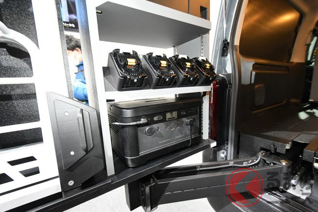 日産の担当者によると、「パワードベースフォープロにはポータブルバッテリーが4つ搭載されていて、それぞれ役割を持って動いています。このバッテリーを使ってさまざまなことができ、職人が楽しく仕事ができるクルマに仕上げました」とのことです。
