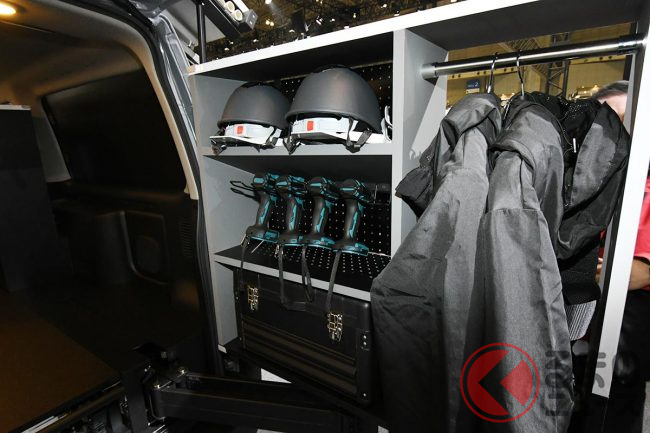 車両後部はクローゼットのような作りになっており、電動工具や作業服、ヘルメットを収納して、現場についてすぐに仕事を始められるようになっているのもポイント。