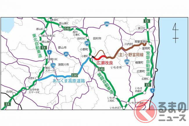 あぶくま高原道路の終点は、磐越道の小野ICですが、そこからさらに東へ道路の延伸工事が進められています。どのような事業なのでしょうか。