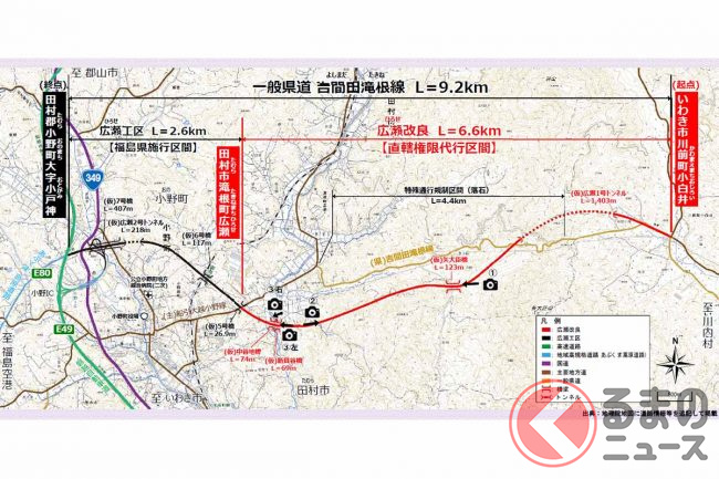 このうち西側の小野ICから田村市滝根町広瀬までの2.6kmは、設計速度80km/hの自動車専用道路として整備されます。