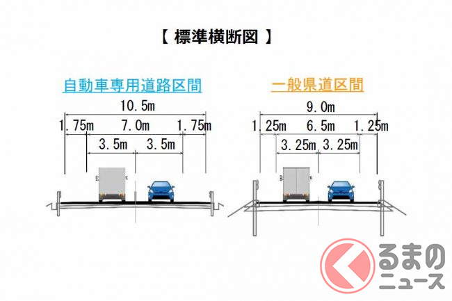 しかし現道は狭い所で道幅が3mほどと狭く、さらに法面崩落や積雪などで通行止めも発生しています。これを、幅9m以上の2車線道路に広げ、走りやすいバイパスとして新たに整備するというものです。