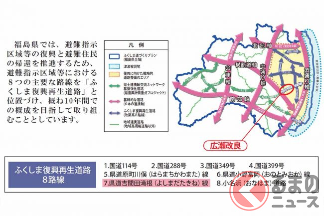 県は、原発事故で生じた避難指示区域などの復興と避難住民の帰還を推し進めるため、避難指示区域などを通る8本の主要道路を「ふくしま復興再生道路」と位置付け、整備・改良を進めています。