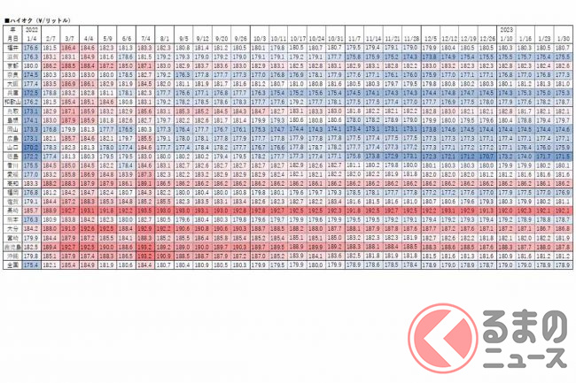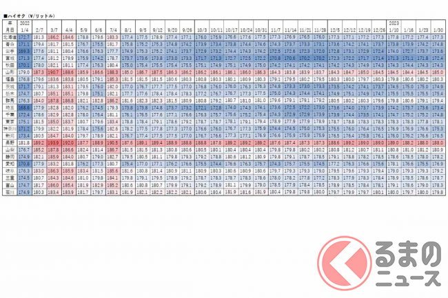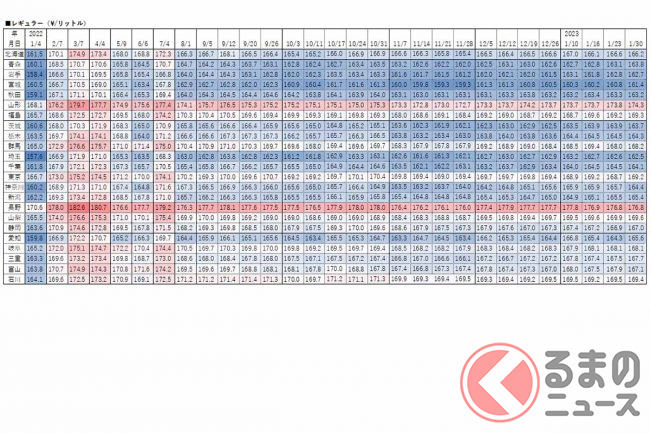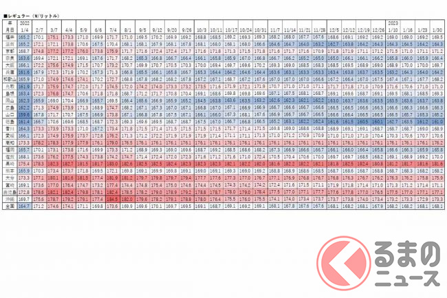 資源エネルギー庁は2023年2月1日、レギュラーガソリンの1月30日時点の店頭小売価格(消費税込)を発表しました。