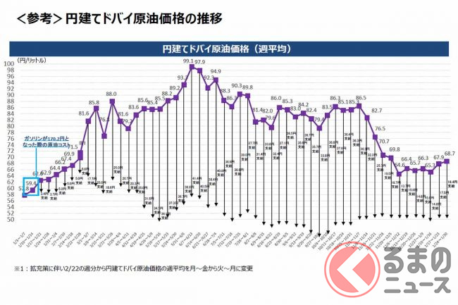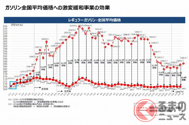 ガソリン価格の高騰を受け、政府は石油元売り企業に補助金を出す価格抑制策を実施。ガソリン、軽油、灯油、重油を対象に2022年1月から1リットルあたり5円、3月から25円、4月から35円を上限に支給しており、さらにそれでもガソリン1リットルの平均価格が170円(4月25日の週からは168円程度)を超過したら、その半分を支援すると発表しています。