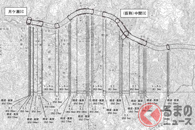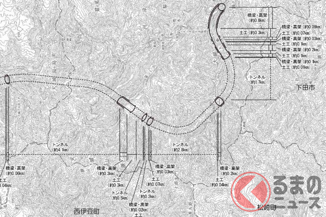 トンネルは9本が計画されていますが、その長さの合計は計画延長約21.6kmのうち6割近く(約12.7km)を占めます。最長は、伊豆市と河津町の境をくぐる峠越えのトンネルで約4.1kmです。
