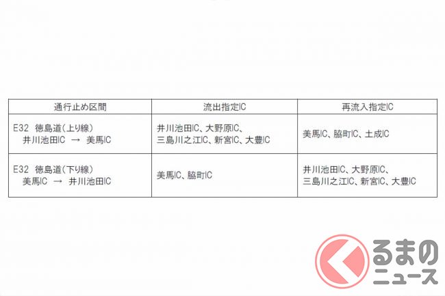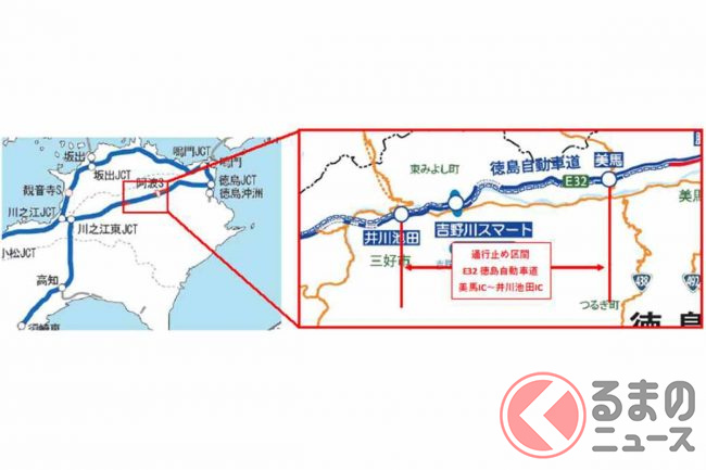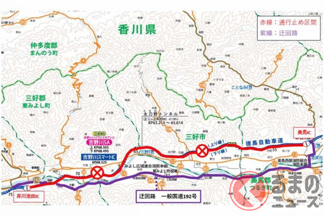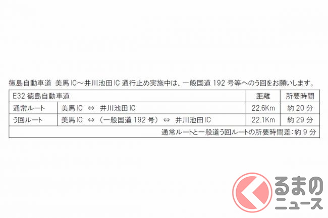 復旧までの間は、並行する国道192号などへ迂回するよう呼び掛けています。ちなみに美馬IC~井川池田IC間を国道で移動すると、所要時間は高速道路より9分長い約29分になるといいます。