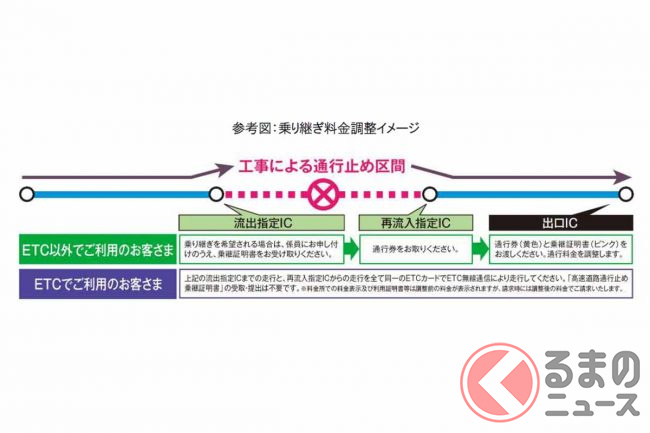 また、通行止め区間を挟んで徳島道を乗り継ぐ場合は、料金調整が行われます。