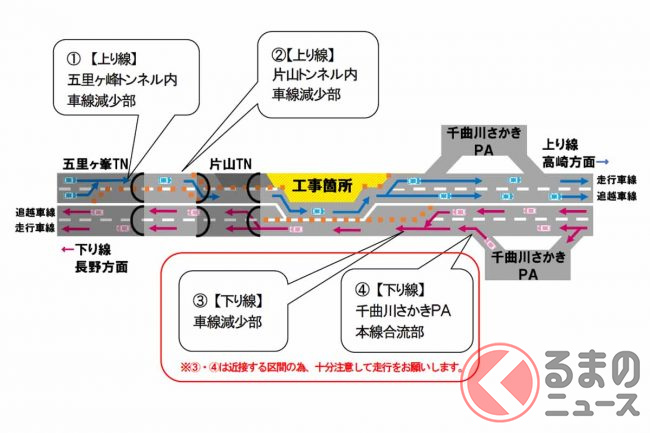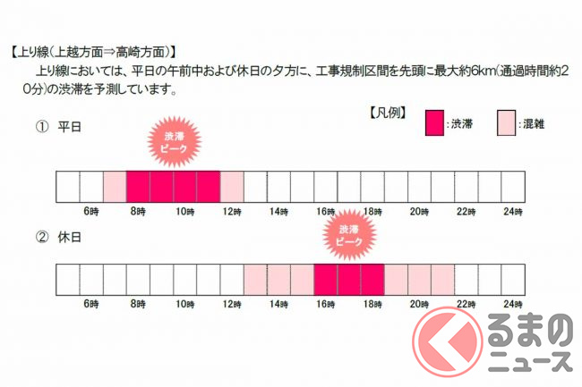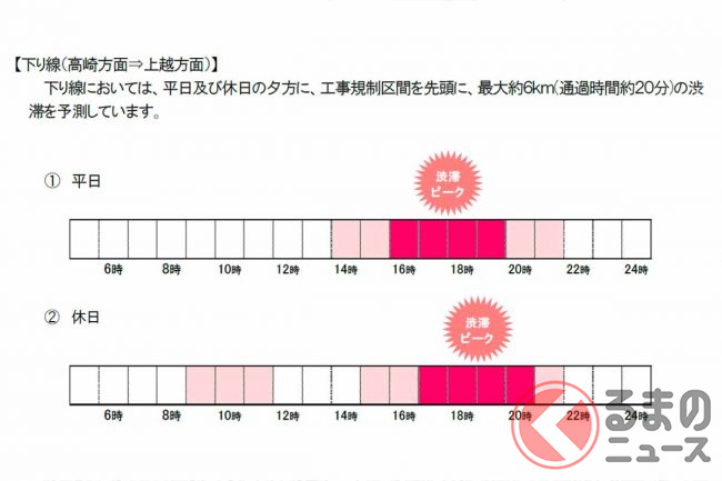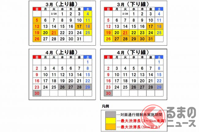 下り線は3月後半の春休み期間を中心に、上り線は平日午前や土休日の夕方を中心に、それぞれ工事規制区間を先頭に最大約6km(通過に約20分)の渋滞が予測されています。