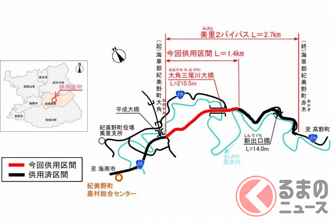今回は、和歌山県紀美野町の大角(平成大橋)から赤木までの1.4km区間が完成し、これにより全線2.7kmが開通します。道路は幅員7.0m(橋梁部6.5m)、2車線です。