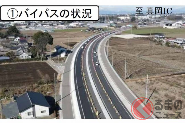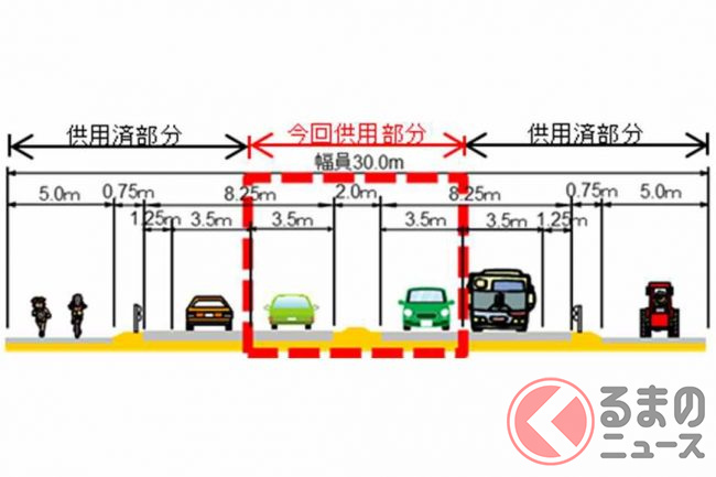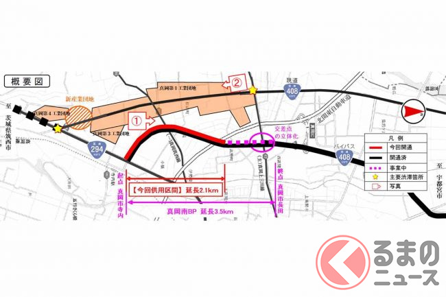 今回、暫定2車線から完成4車線となるのは、全長3.5kmのうち国道294号から北関東道交差付近までの2.1km区間です。