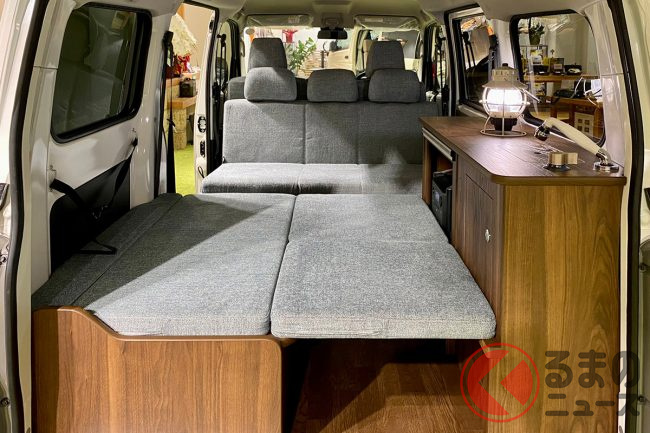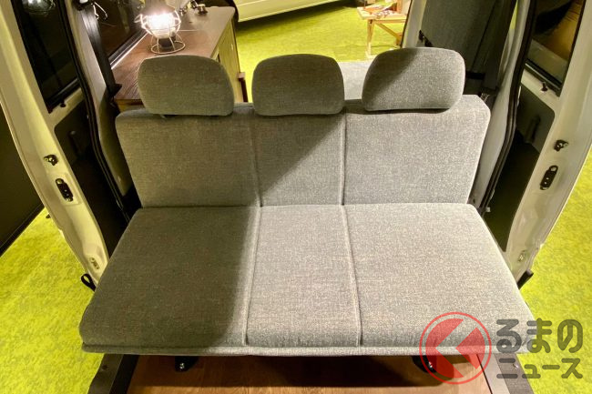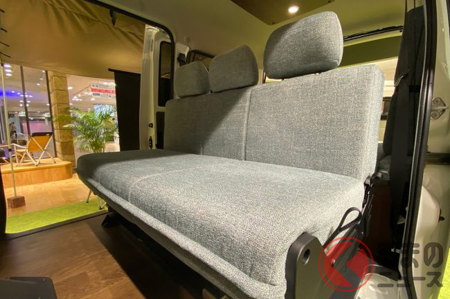 シートは前席、後席ともにファブリック素材を採用。後席を倒しギャレー部のベンチを広げることで、1名+αが就寝可能な縦2m×横1mのフルフラットベッドへと展開することが可能です。