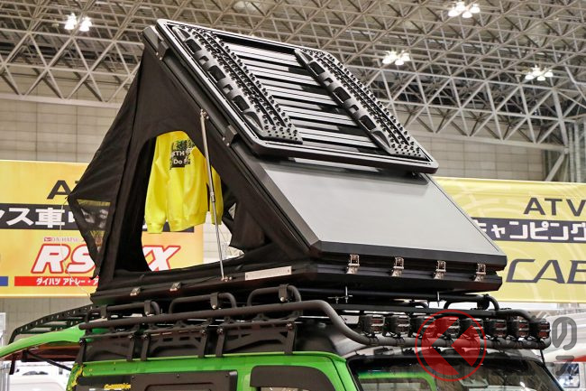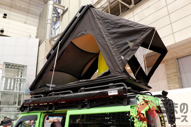 さらにJC2023に出展された車両には、オプションのGIワークス製ルーフトップテントを搭載し、ワイルドさをさらに強調しています。