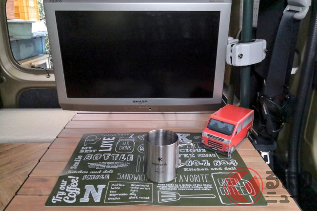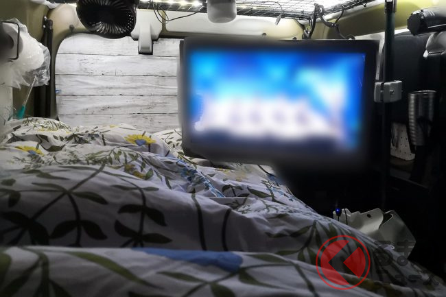 Gわんだ~さんは、イレクターパイプでベッドやテーブル、ソファを作るほか、液晶テレビも車内に設置し、車中泊を楽しんでいるといいます。