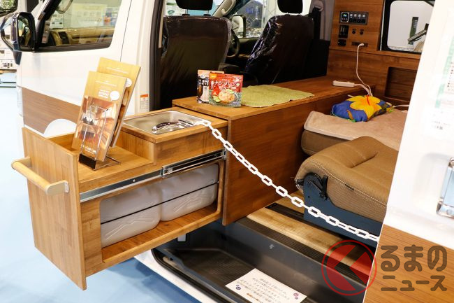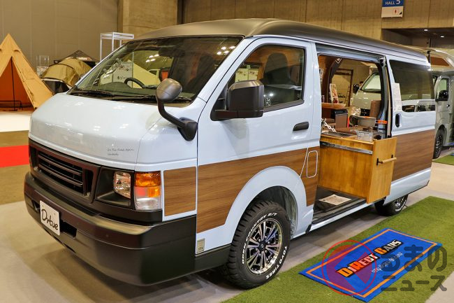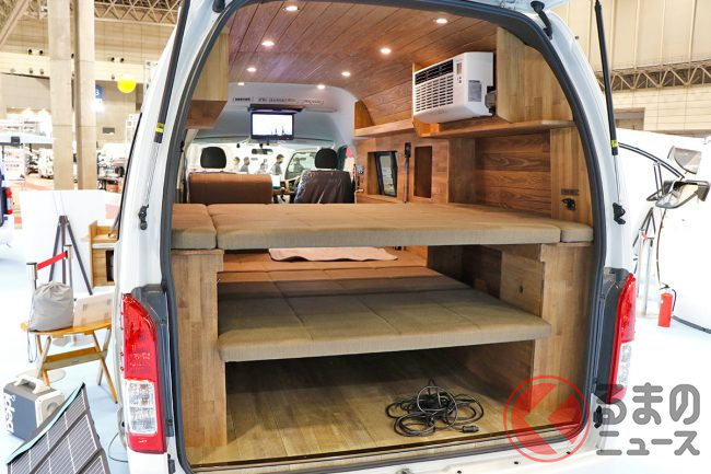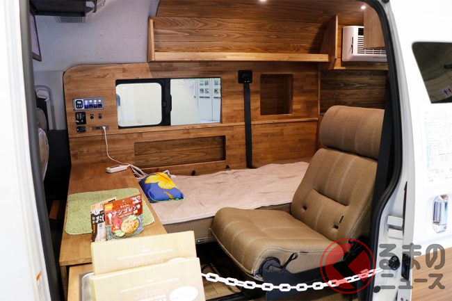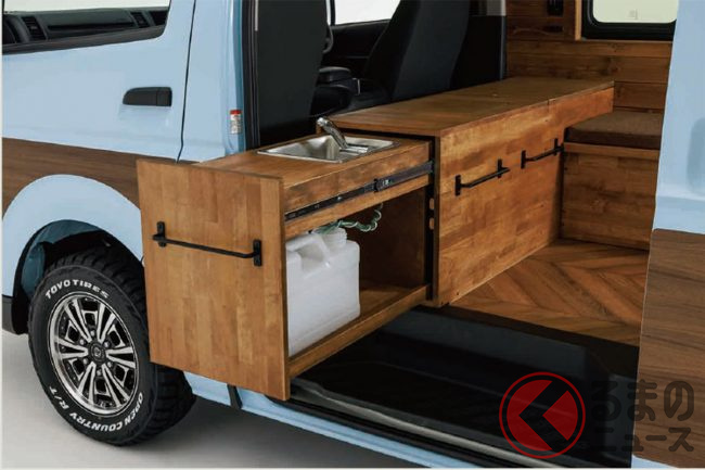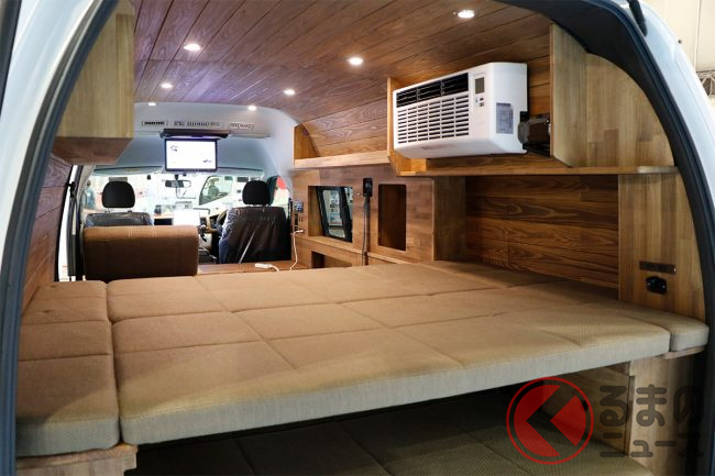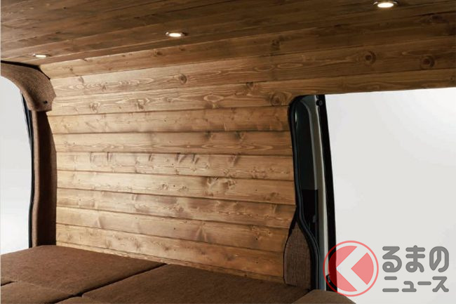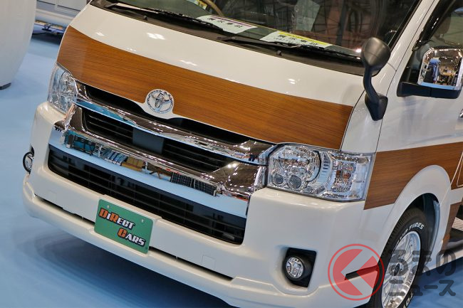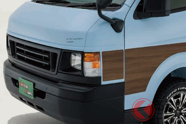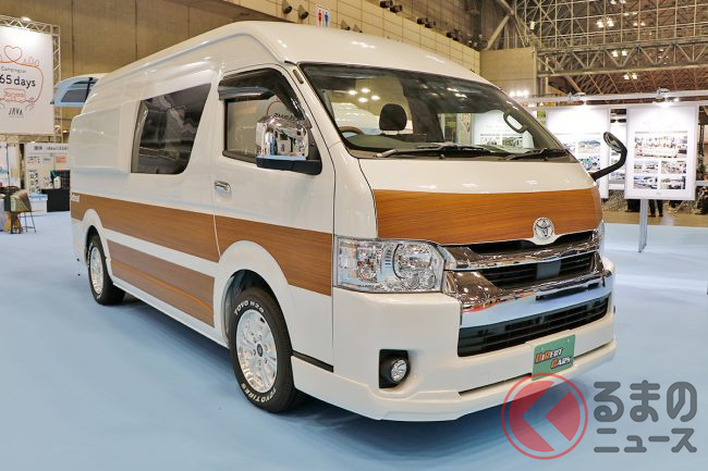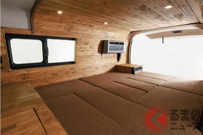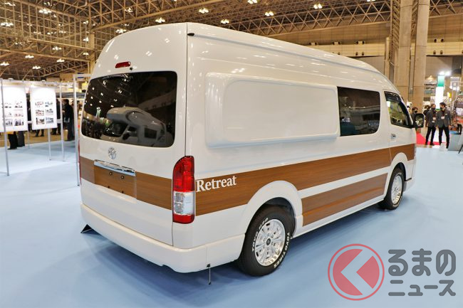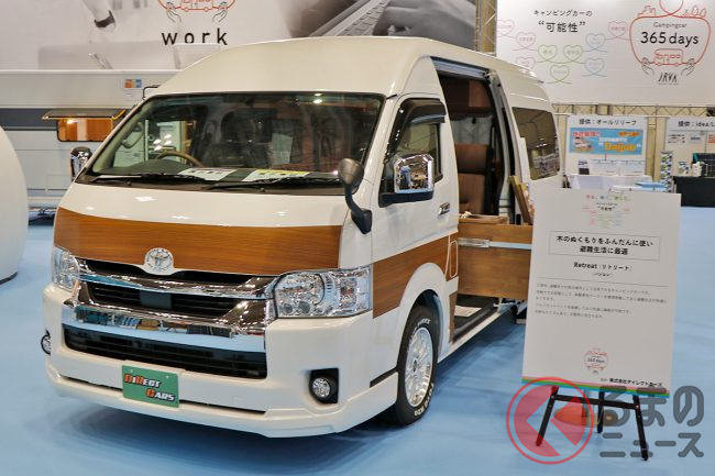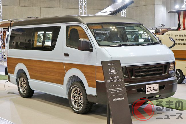 80年代レトロな「ハイエース」!? 懐かしアメ車顔の「車中泊」カー初公開! たっぷり「ウッド」内装も激オシャ!