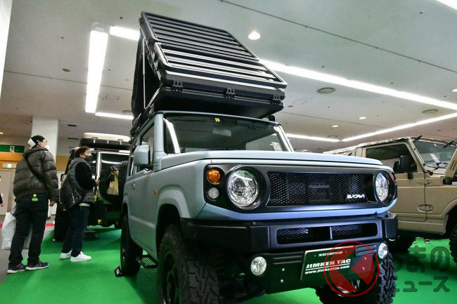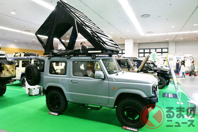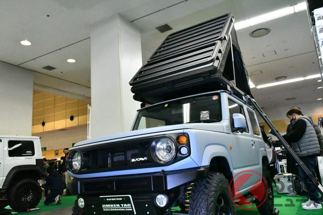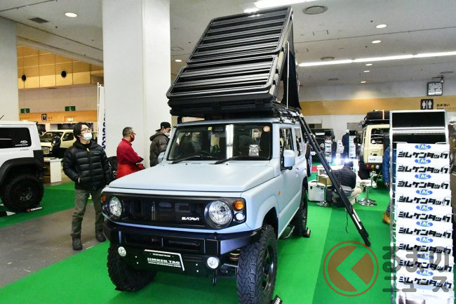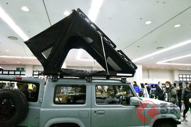 スズキ「ジムニー」で快適「車“上”泊」!? わずか16cmの「うすうす」でも雨風しのげるタフ仕様テントを出展 約48万円から