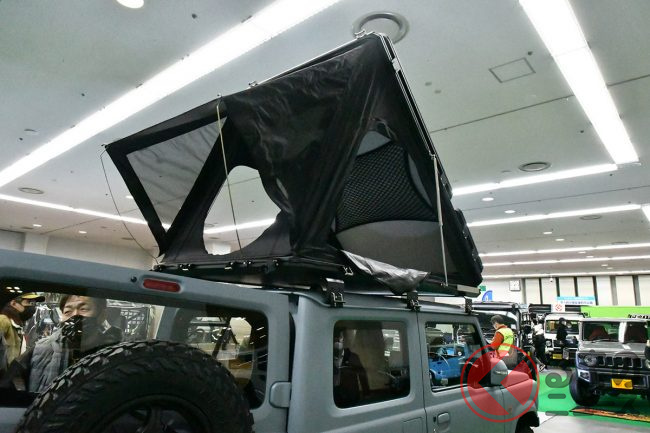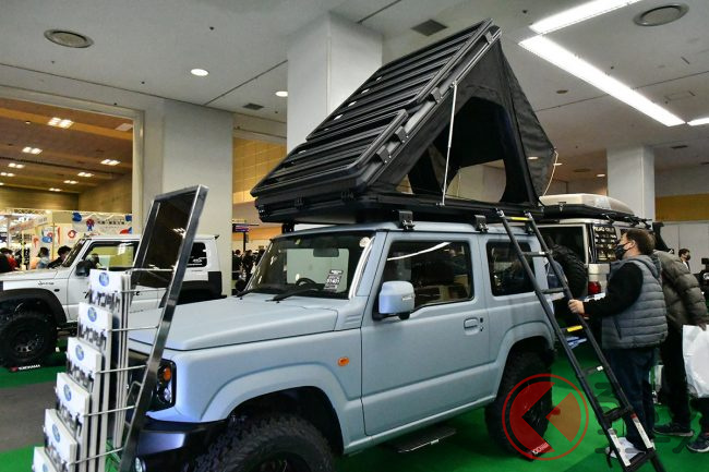 スズキ「ジムニー」をメインに中古車販売やカスタムなどを手掛ける大阪府羽曳野市のタックは、2023年2月10日から3日間開催されたカスタムカーイベント「大阪オートメッセ2023」に、ジムニー向けのルーフトップテントを出展しました。