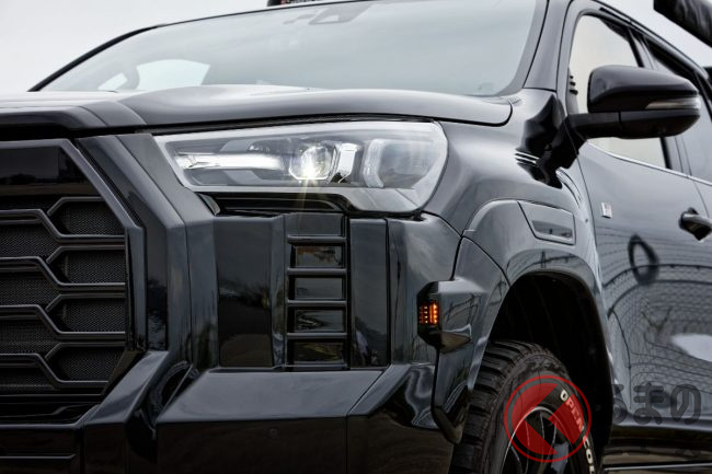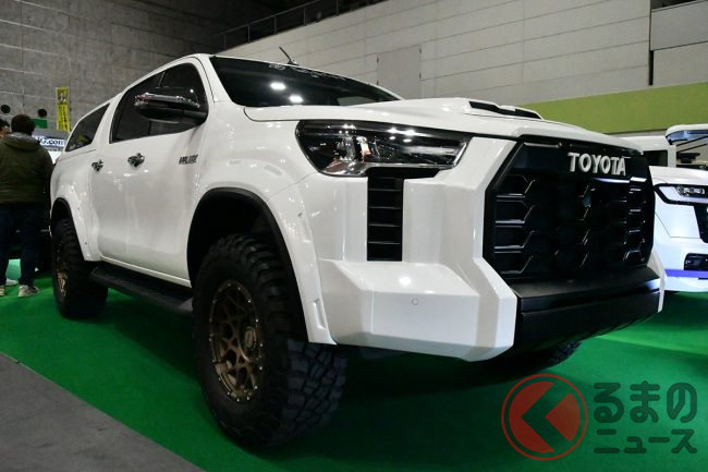 日本で販売されているトヨタ「ハイラックス」をトヨタ「タンドラ」のフェイスデザインに似せられるボディキットが大阪オートメッセ2023に出展しました。
