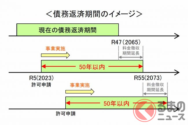 これにより高速道路の有料期間は、現在の2065年から最大50年後の2115年まで設定されることになります。