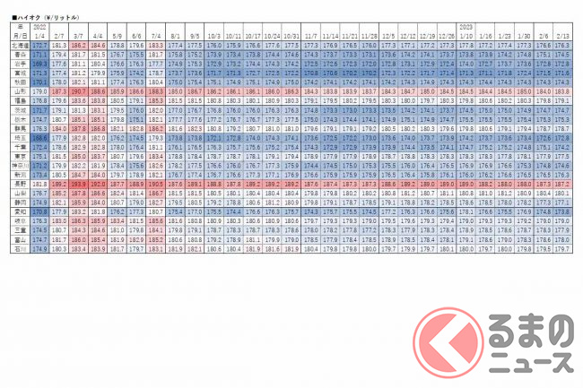 一方、最も高かったのは長崎県で180.9円、次いで鹿児島県176.3円、高知県176.1円でした。