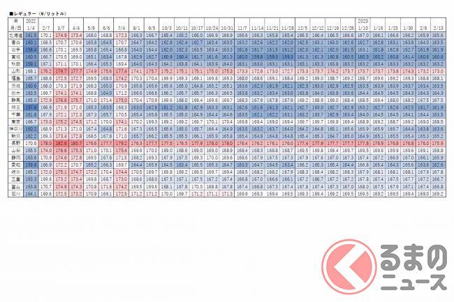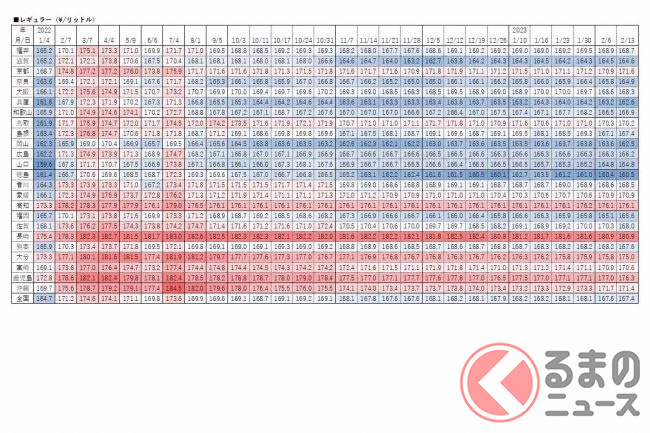 経済産業省資源エネルギー庁は2023年2月15日、レギュラーガソリンの13日時点の店頭小売価格(消費税込)を発表しました。