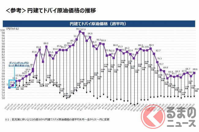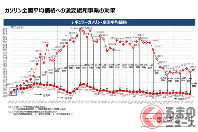 なお、経産省によると、補助金がない場合のレギュラーガソリンの全国平均小売価格は、2月13日時点で1リットル183.5円と算出しており、次回調査日の来週20日時点で185.3円に上がると見ています。ちなみにこの「補助金なし」の価格は、2022年12月以降、180円台を小刻みに上下しています。