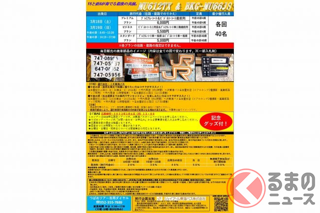 ラストランツアー「V8と直6が奏でる最後の共演。MU612TX&BKG-MU66JS」は、3月18日と19日のそれぞれ午前・午後に開催。旅行代金は5000円から6000円です。