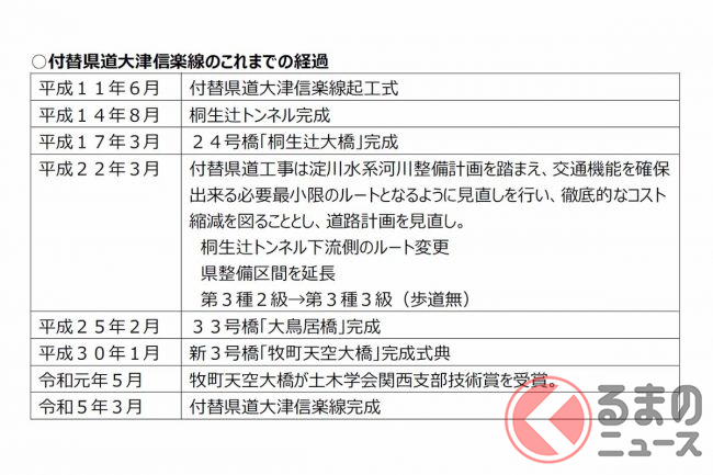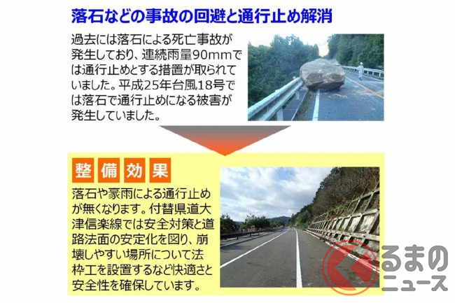 近畿地方整備局によると、この付替県道の開通によってすれ違いが困難な道幅の狭い箇所がなくなり、所要時間も短縮。連続雨量90mmの通行止め措置もなくなり、安全性も確保されるといいます。
