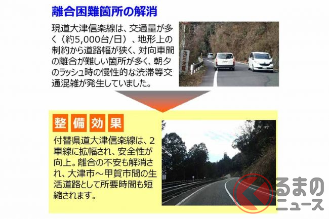 大津市・草津市と甲賀市を結ぶ主要ルートの一つで交通量も1日5000台と多い幹線ですが、途中の大戸川ダムの予定地付近は道幅が狭く落石も多いため、渋滞や事故がたびたび発生。