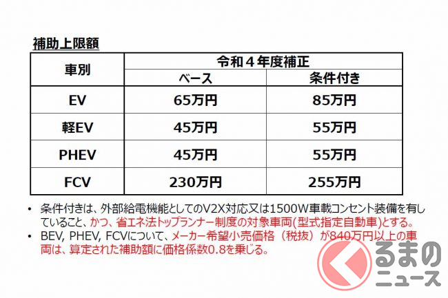 補助上限額は、EVは65万円(給電機能付きは85万円)、PHEVは45万円(同55万円)などとなっています。