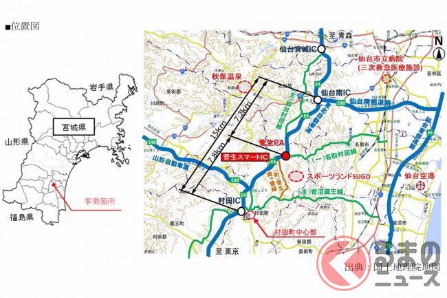 菅生スマートICは、東北道の村田ICから7.8km北側、仙台南ICから7.2km南側の位置にある既存の菅生PA(村田町)に併設されます。