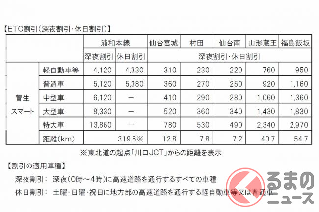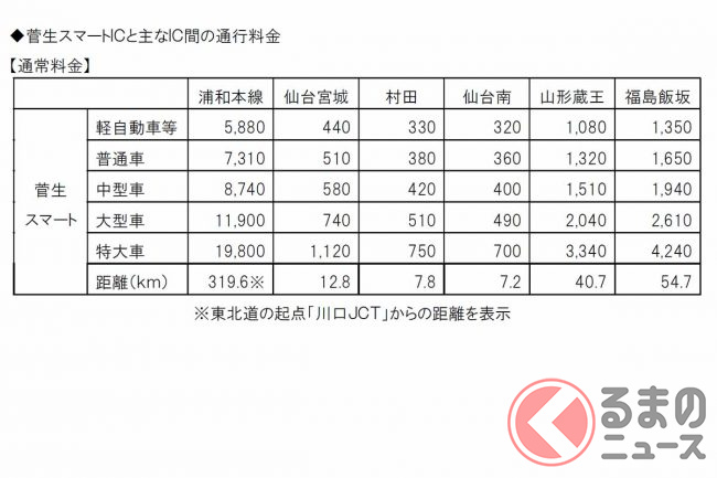 菅生スマートICまでの通行料金(普通車・通常料金)は、浦和本線から7310円、福島飯坂ICから1650円、村田ICから380円、仙台南ICから360円、仙台宮城ICから510円、山形蔵王ICから1320円です。