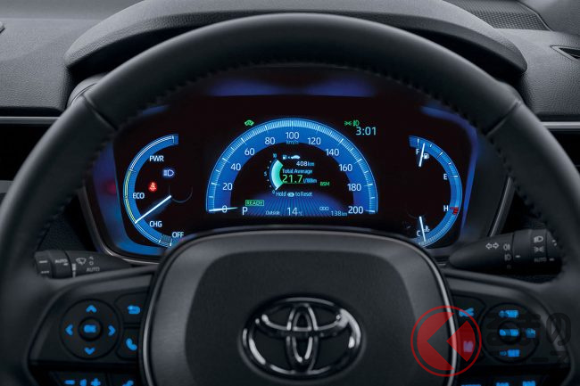 エクステリアはガソリンモデルとは差別化が図られ、ヘッドライトのインナーがブルーとなるほか、グリル中央のトヨタエンブレムもブルーとなり、GRバッジとハイブリッドエンブレムの両方が装備されます。