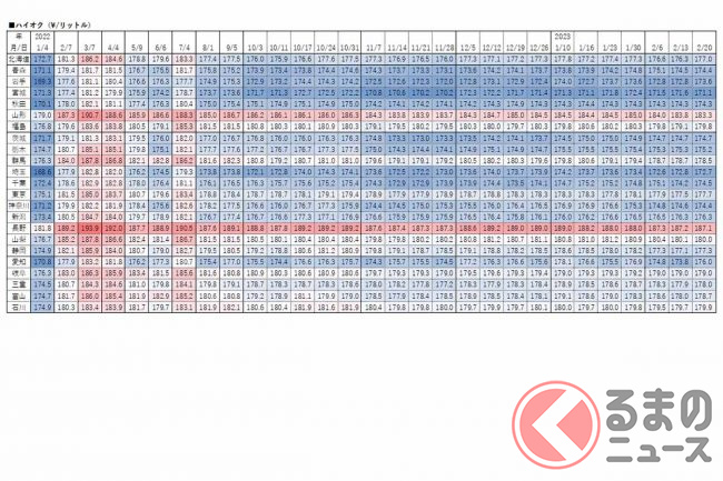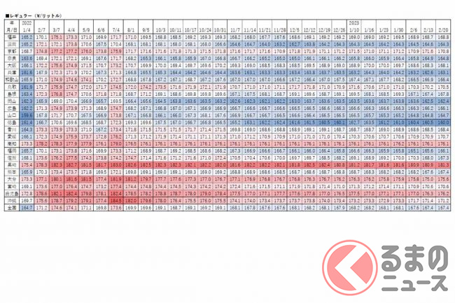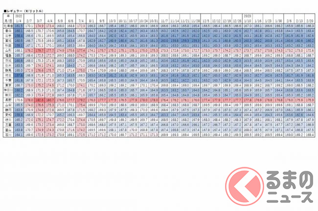経済産業省資源エネルギー庁は2023年2月22日、レギュラーガソリンの20日時点の店頭小売価格(消費税込)を発表しました。