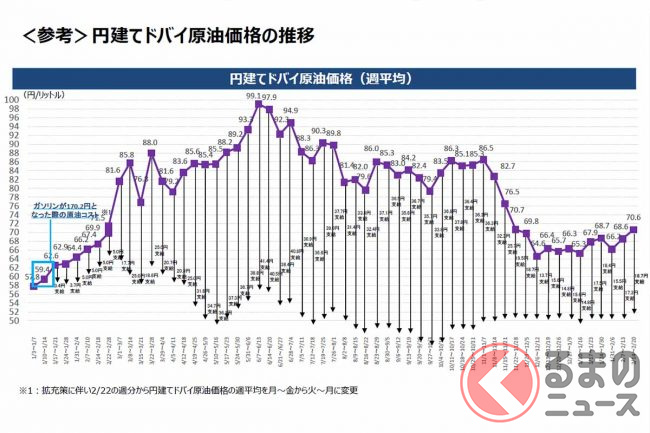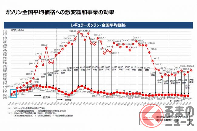 なお、経産省によると、補助金がない場合のレギュラーガソリンの全国平均小売価格は、2月20日時点で1リットル185.3円と算出しており、次回調査日の来週27日時点で186.7円に上がると見ています。ちなみにこの「補助金なし」の価格は、2022年12月以降、180円台を小刻みに上下しています。