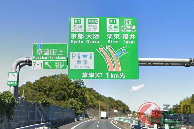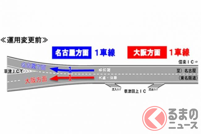 名神高速と新名神高速が交わる草津JCT(滋賀県草津市)は、下りの京都方面へ向かうクルマで渋滞が発生していましたが、車線運用を変えることで大幅に改善したといいます。どのように改良したのでしょうか。