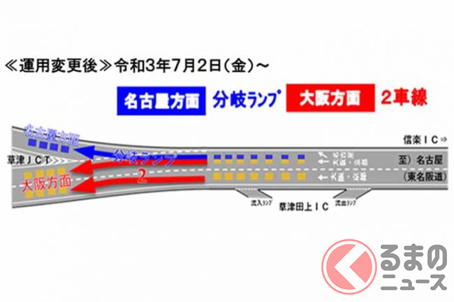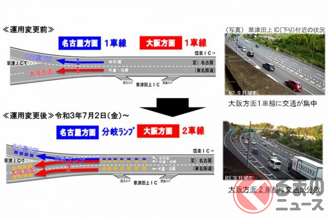 NEXCO西日本は2023年2月27日、草津JCTでの車線運用変更後1年の効果を発表しました。