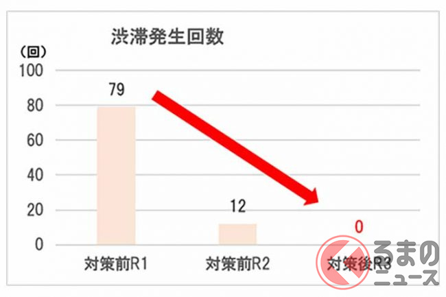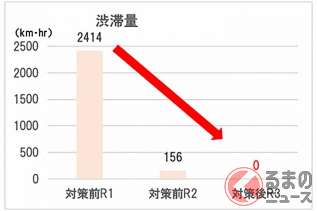 しかし実際は京都方面へ向かうクルマが多く、名神下りにつながる左側車線が混雑する状態に。そのためコロナ禍前の2019年の1年間には、交通集中による渋滞が79回、「渋滞長×渋滞継続時間」の渋滞量にすると2414km・h発生していたといいます。