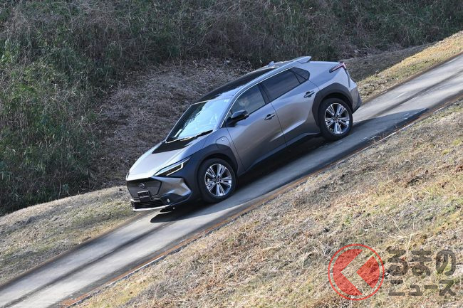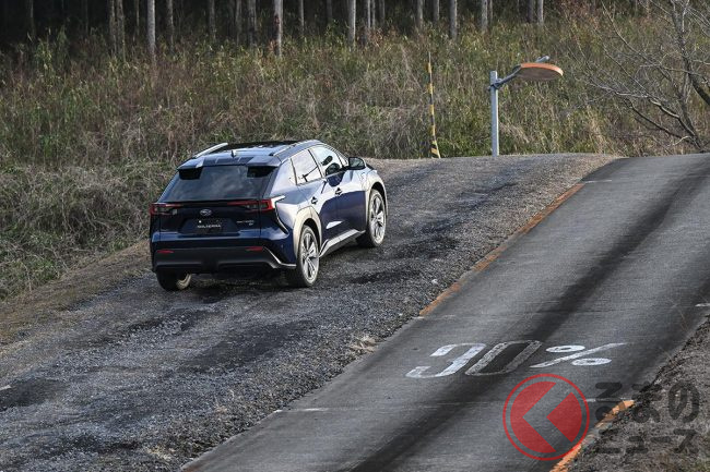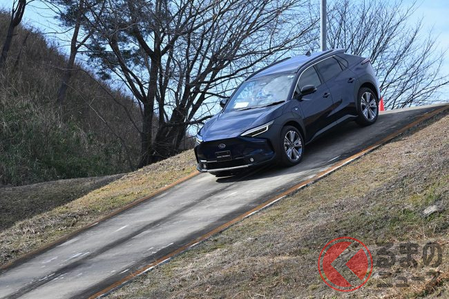 次いで、純BEVである「ソルテラ」のAWDで走破性と動的質感を確認。前後にモーターを独立して搭載したことによってエンジニアの考える最適な駆動力を配分できることが強みで、砂利路面の急坂でも発進性に優れることやヒルディセント機能を体感しました。
